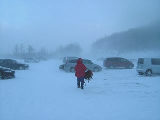 凍てついた道を、奥岳の登山口まで飛ばして行く。 奥岳の駐車場に入り、スキー場へ。 直接くろがね小屋をめざすことになり、とりあえず支度を始める。 |